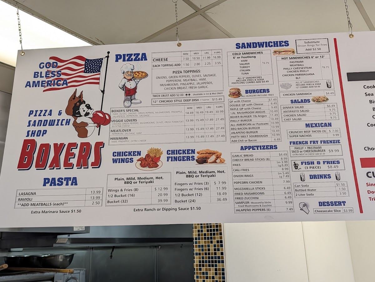 In conclusion, Boxers Pizza & Sandwich Shop’s menu is an excellent choice for a casual meal, offering a variety of affordable and delicious options. From pizzas and wings to burgers and desserts, it's a perfect spot for families, friends, or anyone looking for tasty comfort food.